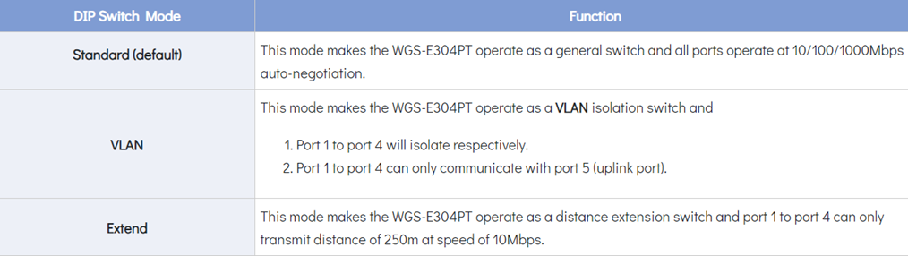 | 3.DIP撥動開關,用於操作模式選擇 WGS-E304PT 提供「標準」、「VLAN」或「延伸」模式。 |