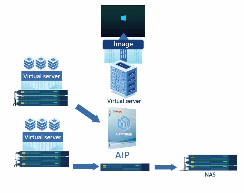 1. 將前端虛擬平台全權交由AIP快速備份至備份主機,平時備份可不停機服務,再複製一份到NAS,減低資料遺失風險